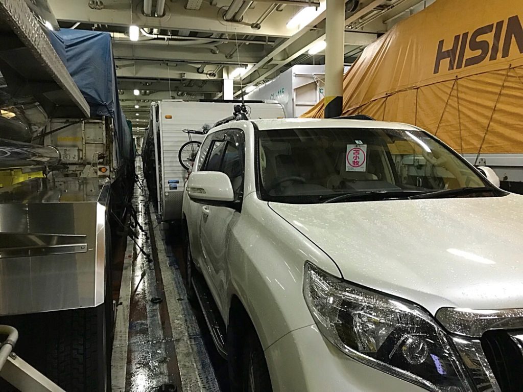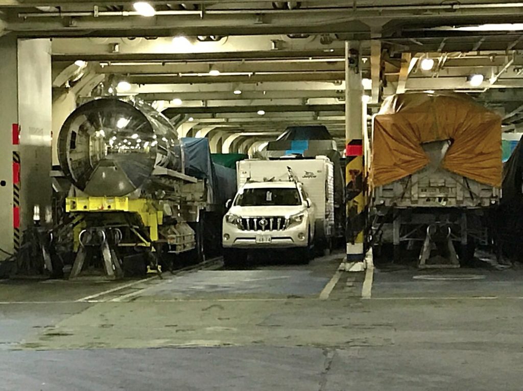 車両甲板の様子です。大型トレーラーの間の狭い隙間にバックで入れました。ちょっと大変でしたがうまくいきました👍👍バックが出来ない時は切り離して手押しで入れるみたいですね??それと、AC100Vの電源はもらえませんでした。
