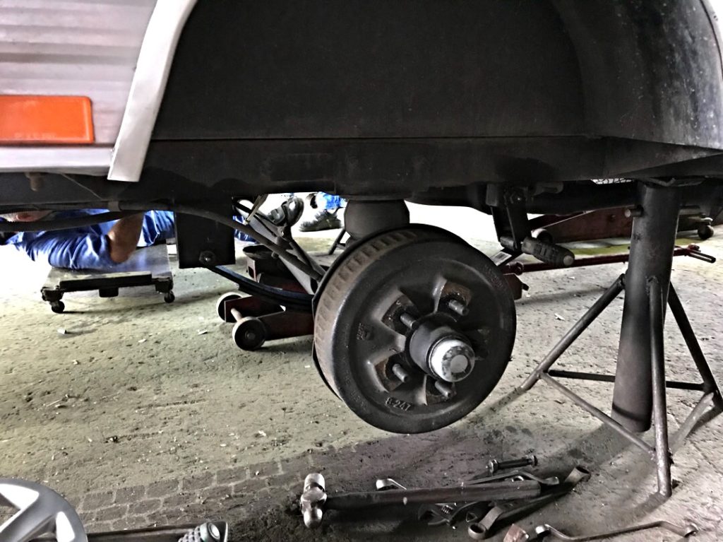 部品も来て今日はやっと修理開始です。無事にリーフスプリングの交換も終わり、部品を持っていたので、一緒にブレーキライニングの交換もお願いしました。