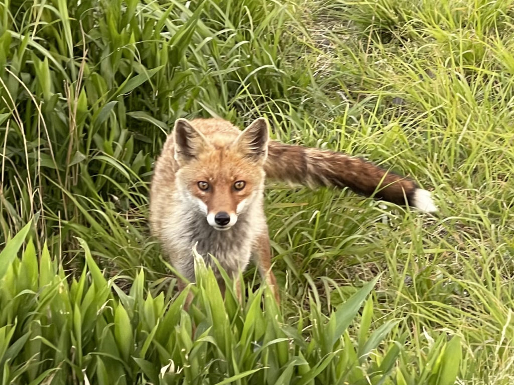 夕方になってキツネさんが現れました。北海道ではよく見かけましたが、九州でこれだけ間近で見たのは初めてです。