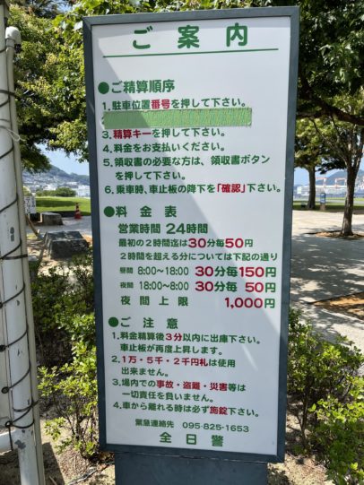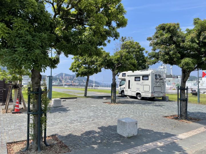長崎市内での車中泊は水辺の森公園の北側の一番海側のコインパーキングが泊めやすくて眺めもよくて、出島ワーフにも近くて良いですね。トイレからはちょっと遠いですが。