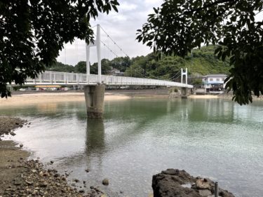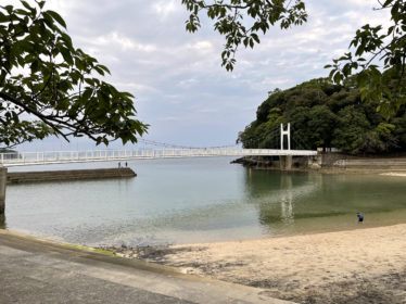 砂浜のすぐ向こうに有る、湯の児島公園(小島)まで人が渡れる吊り橋が掛かっており、散歩コースにちょうど良い感じでした。