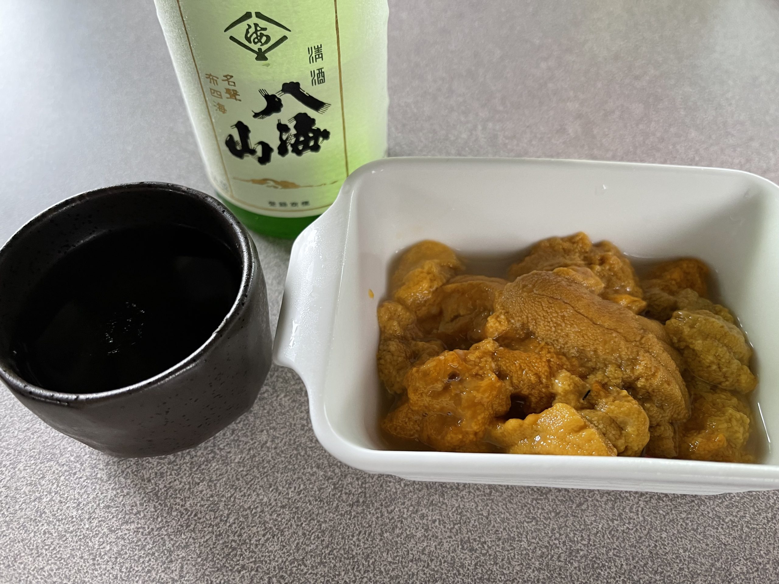 4時、北海道の気持ち良い風に当たりながら、増毛で仕込んだ雲丹で一杯始めます。