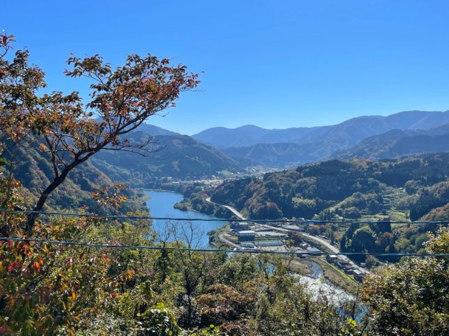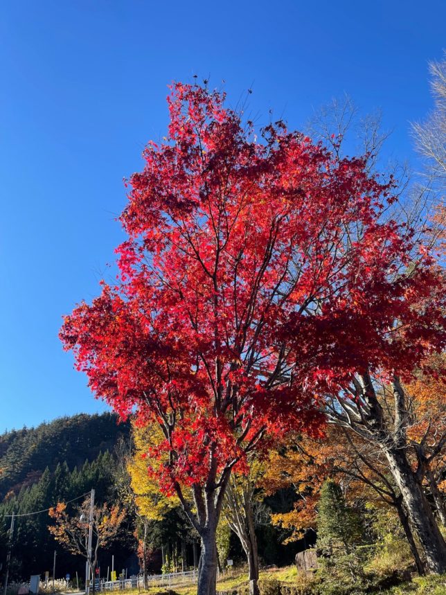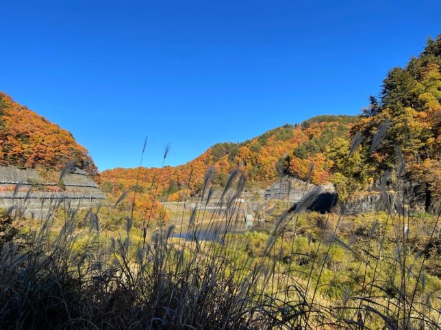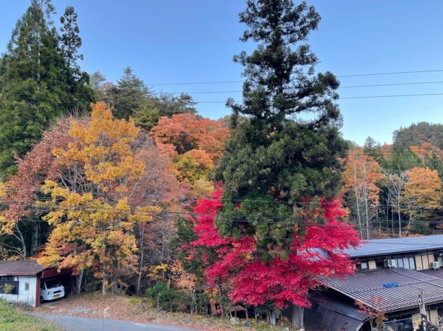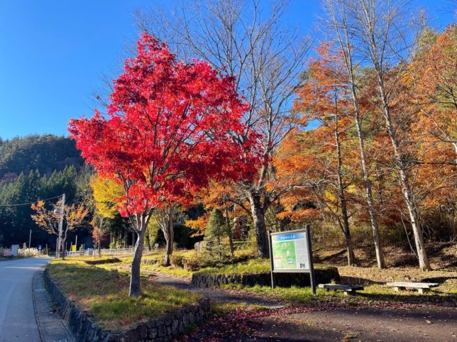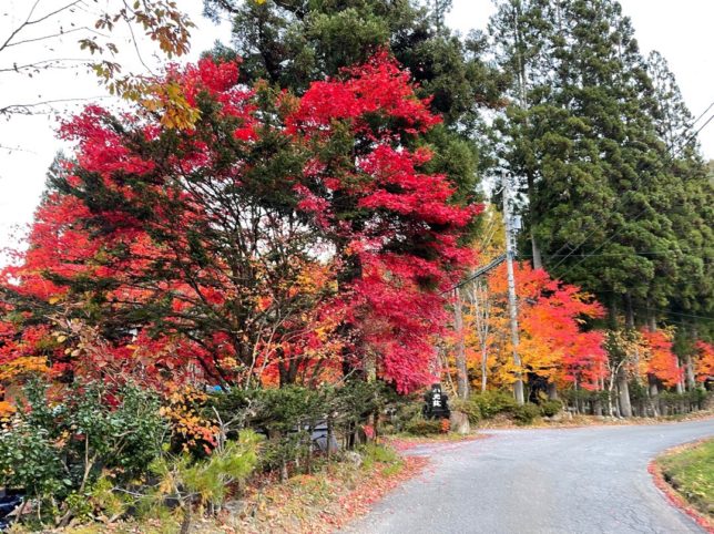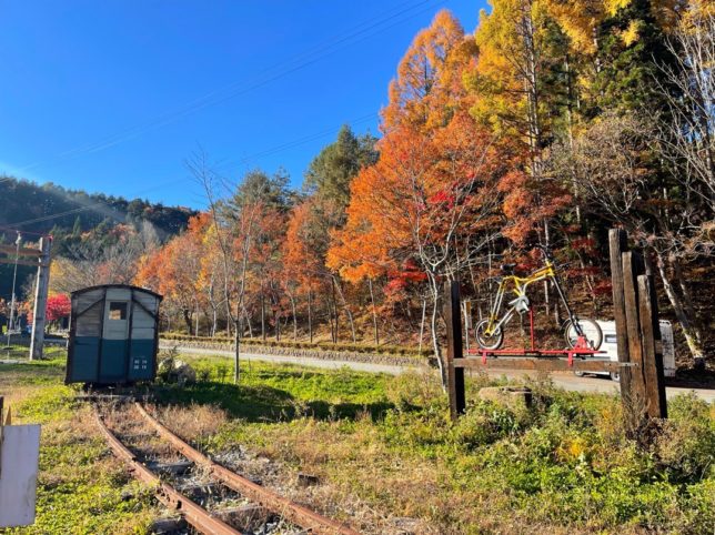 75号線の神原峠、紅葉の「トロッコ駅 とうげ」の駐車場で一休み。